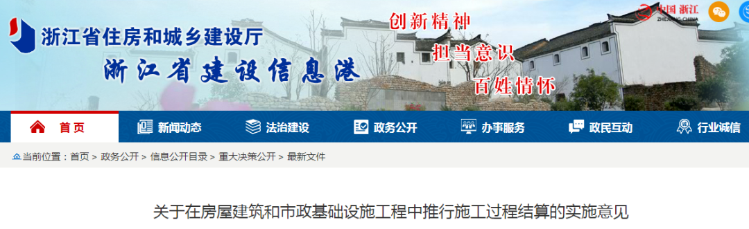 浙江省2020年5月20日,浙江省住建厅发布《关于在房屋建筑和市政基础设施工程中推行施工过程结算的实施意见》:自6月20日起,在全省房建和市政项目中全面推行施工过程结算。