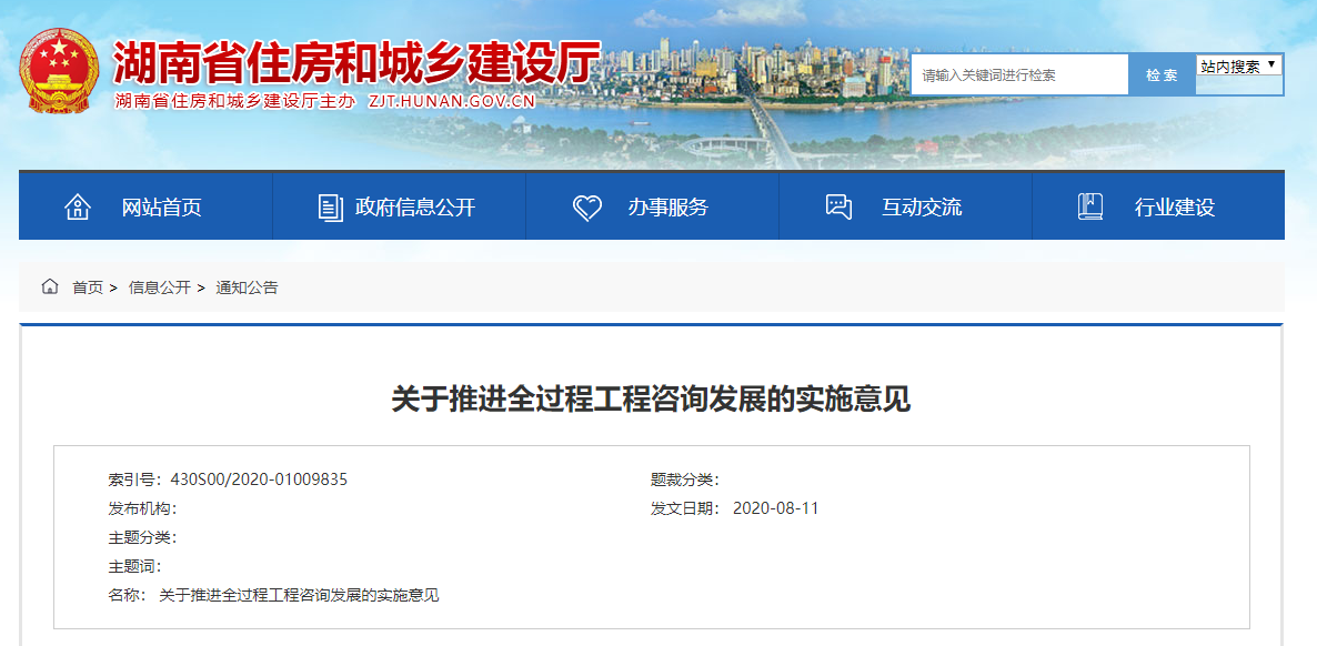 8月11日,湖南省住建厅发布《关于推进全过程工程咨询发展的实施意见》。