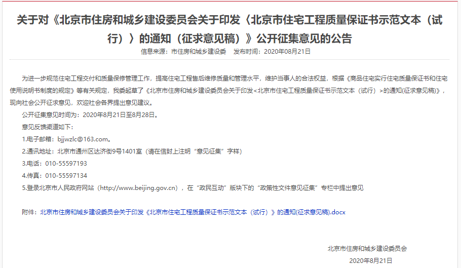 未来,购房人在办理新房收房手续时,除了《竣工验收备案表》外,还得记得让开发商提供质量保证书。8月21日,北京市住建委发布《关于印发〈北京市住宅工程质量保证书示范文本(试行)〉的通知(征求意见稿)》的公告,并面向社会就《北京市住宅工程质量保证书示范文本(试行)》公开征求意见。