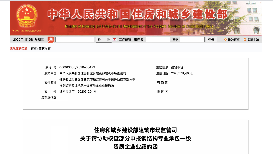 11月5日,住建部向各省厅发出协查新申报企业资质业绩的函,通过实地核查业绩加大对企业资质申报弄虚作假行为打击力度。