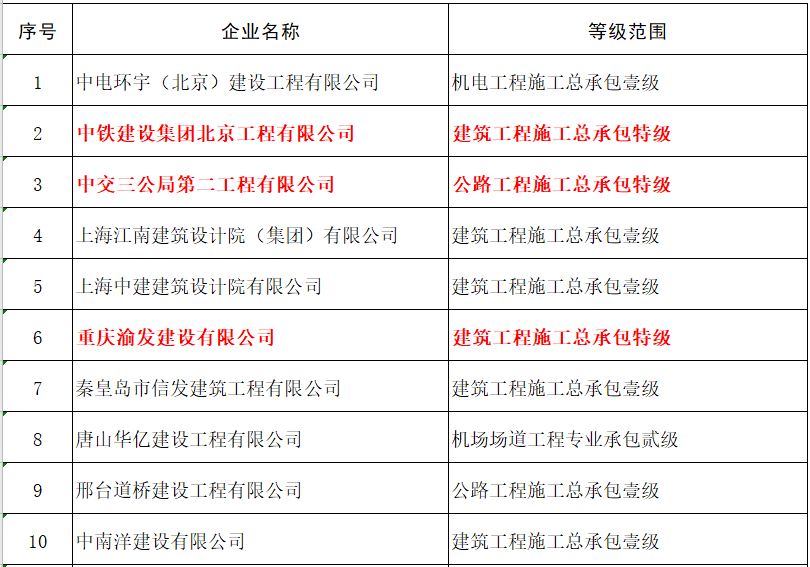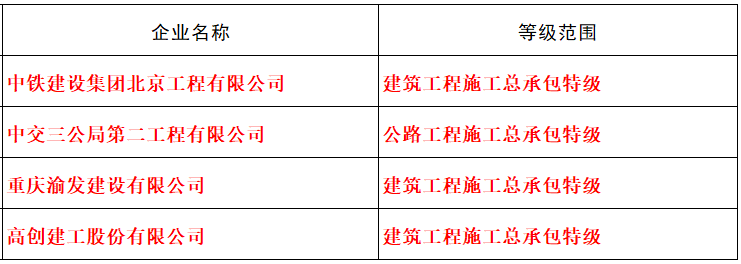 四家建企新增施工总承包特级资质: