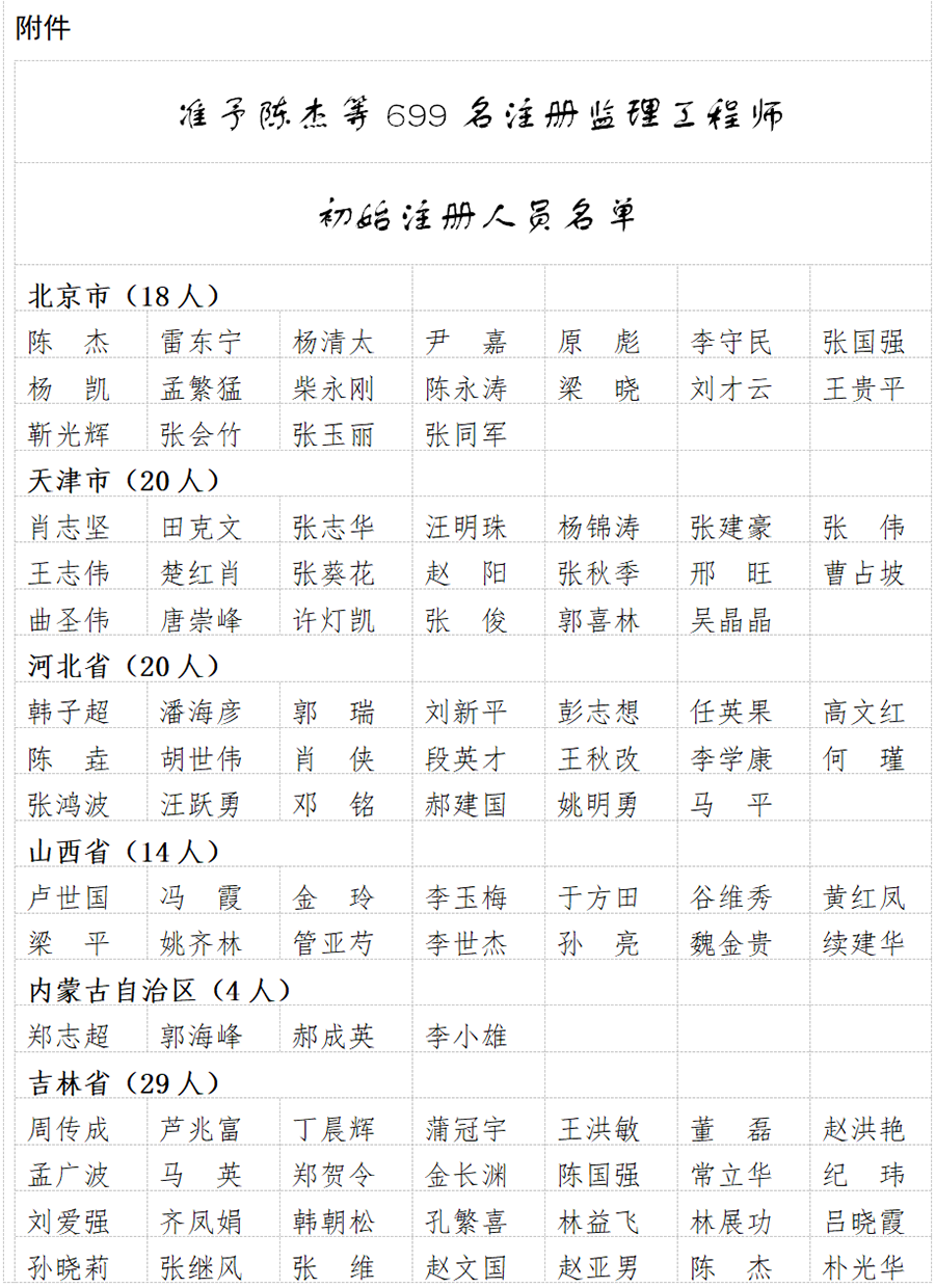 附件:准予陈杰等699名注册监理工程师初始注册人员名单