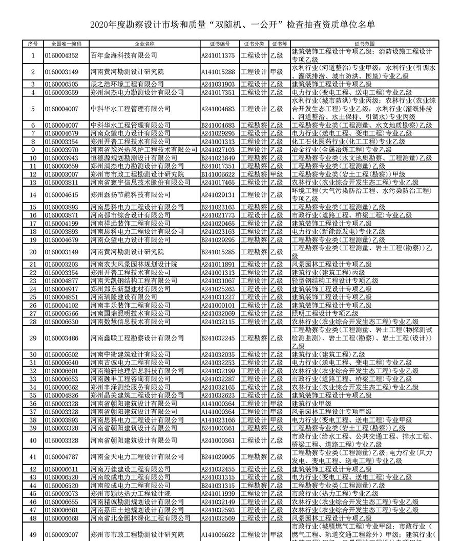 郑州公示勘察设计市场和质量“双随机、一公开”检查抽查资质单位名单