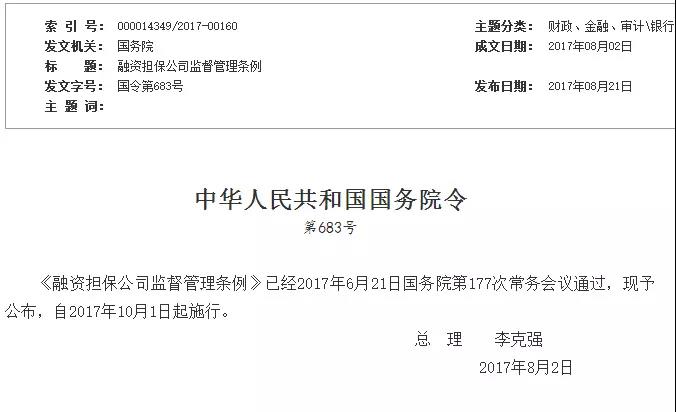 为了规范融资担保公司的行为,防范风险,2017年8月2日,国务院总理李克强签署国务院令683号,公布《融资担保公司监督管理条例》(以下简称条例),自2017年10月1日起施行。