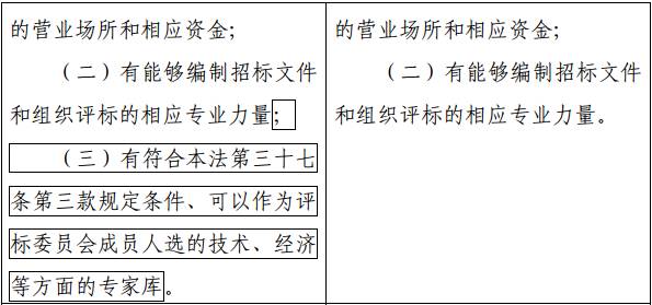 1、在原文件“中标人的投标应当符合下列条件:(一)能够最大限度地满足招标文件中规定的各项综合评价标准;能够满足招标文件的实质性要求,并且经评审的投标价格最低;但是投标价格低于成本的除外。”后增设一条“前款第二项中标条件适用于具有通用技术、性能标准或者招标人对其技术、性能没有特殊要求的招标项目?!?/span>