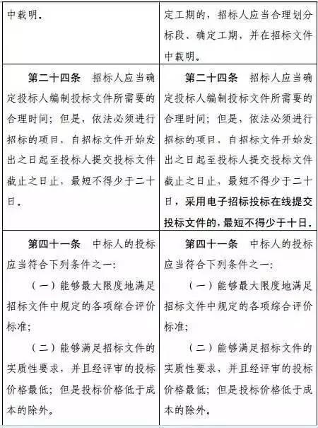 五、将第二十四条修改为:“招标人应当确定投标人编制投标文件所需要的合理时间;但是,依法必须进行招标的项目,自招标文件开始发出之日起至投标人提交投标文件截止之日止,最短不得少于二十日,采用电子招标投标在线提交投标文件的,最短不得少于十日?!?/span>