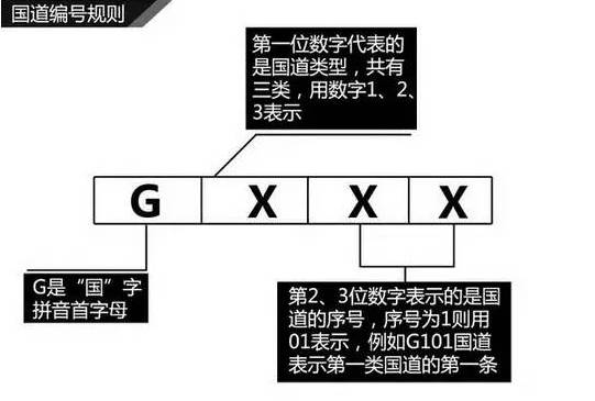 国道:字母后第一位数字为1表示以北京为中心呈放射线的国道,2表示南北走向、3表示东西走向。