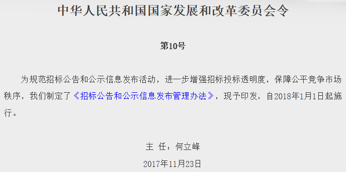 近日,为规范招标公告和公示信息发布活动,进一步增强招标投标透明度,保障公平竞争市场秩序,国家发改委引发《招标公告和公示信息发布管理办法》(国家发展改革委第10号令,以下简称《办法》),自2018年1月1日起施行。