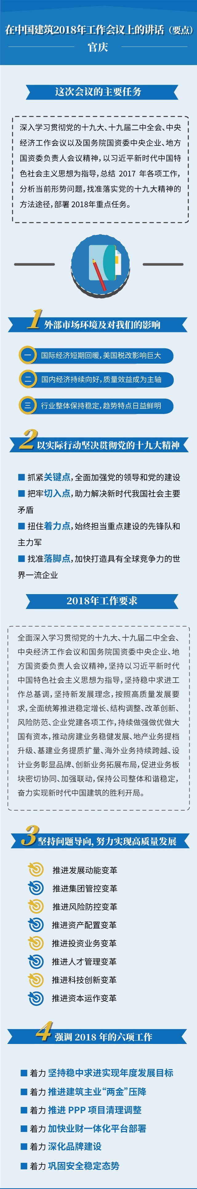 会议深入分析了当前面临的形势,指明了公司改革发展方向,明确了2018年中国建筑发展的主要目标和重点任务。