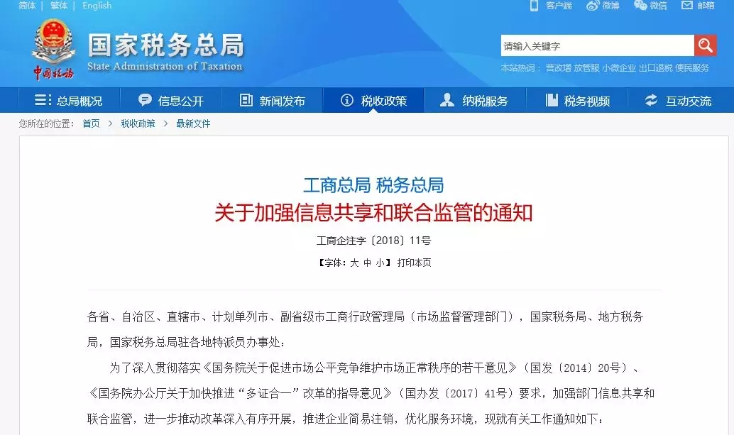 1月24日电 据工商总局网站消息,工商总局、税务总局近日发布《关于加强信息共享和联合监管的通知》。通知要求协同推进企业简易注销登记改革,建立协同监管和信息共享机制,这将使企业注销登记更简易。