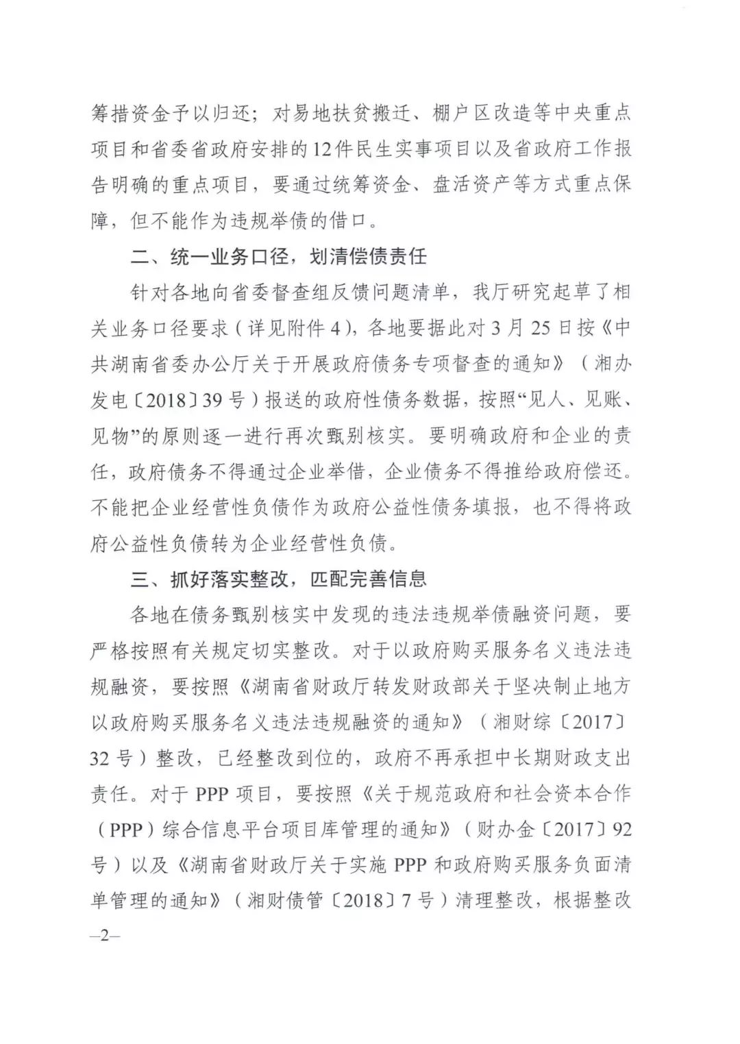 针对各地向省委督查组反馈问题清单,我厅研究起草了相关业务口径要求(见附件4),各地要据此对3月25日按《中共湖南省委办公厅关于开展政府性债务专项督查的通知》(湘办发电[2018]39号)报送的政府性债务数据,按照“见人、见账、见物”的原则逐一进行再次甄别核实。要明确政府和企业的责任,政府债务不得通过企业举借、企业债务不得推给政府偿还。不能把企业经营性负债作为政府公益性债务填报,也不得将政府公益性负债转为企业经营性负债。