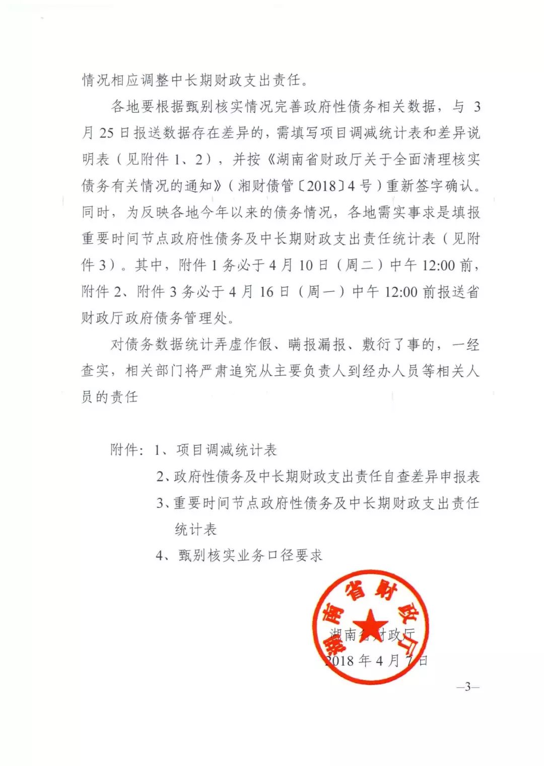 各地要根据甄别核实情况完善政府性债务相关数据,于3月25日报送数据存在差异的,需填写项目调减统计表和差异说明表(见附件1、2),并按《湖南省财政厅关于全面清理核实债务有关情况的通知》(湘财债管[2018]4号)重新签字确认。同时,为反映各地今年以来的债务情况,各地需实事求是填报重要时间节点政府性债务及中长期财政支出责任统计表(见附件3)。其中,附件1务必于4月10日中午12:00前,附件2、附件3务必于4月16日中午12:00前报送省财政厅政府债务管理处。