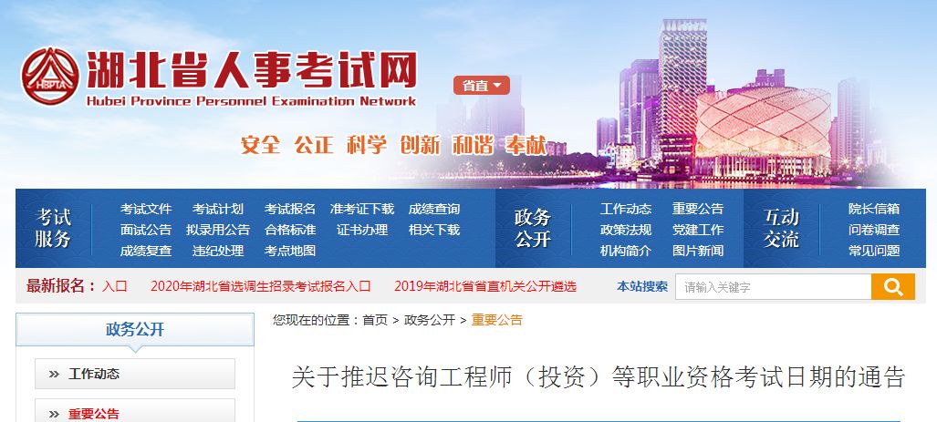 为贯彻中央及湖北省新冠肺炎疫情防控的有关工作要求,根据人力资源和社会保障部人事考试中心有关通知,现就推迟2020年度咨询工程师(投资)等职业资格考试日期有关事项通告如下: