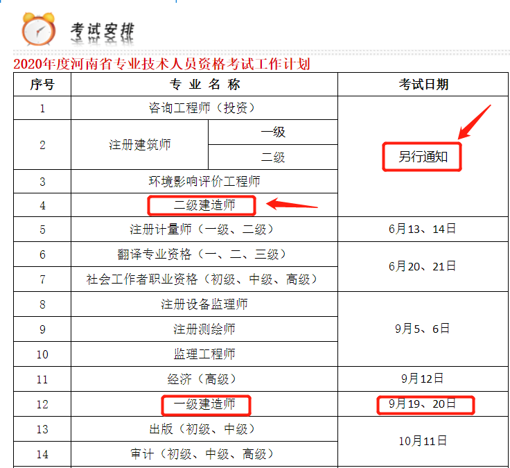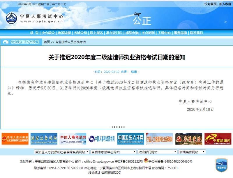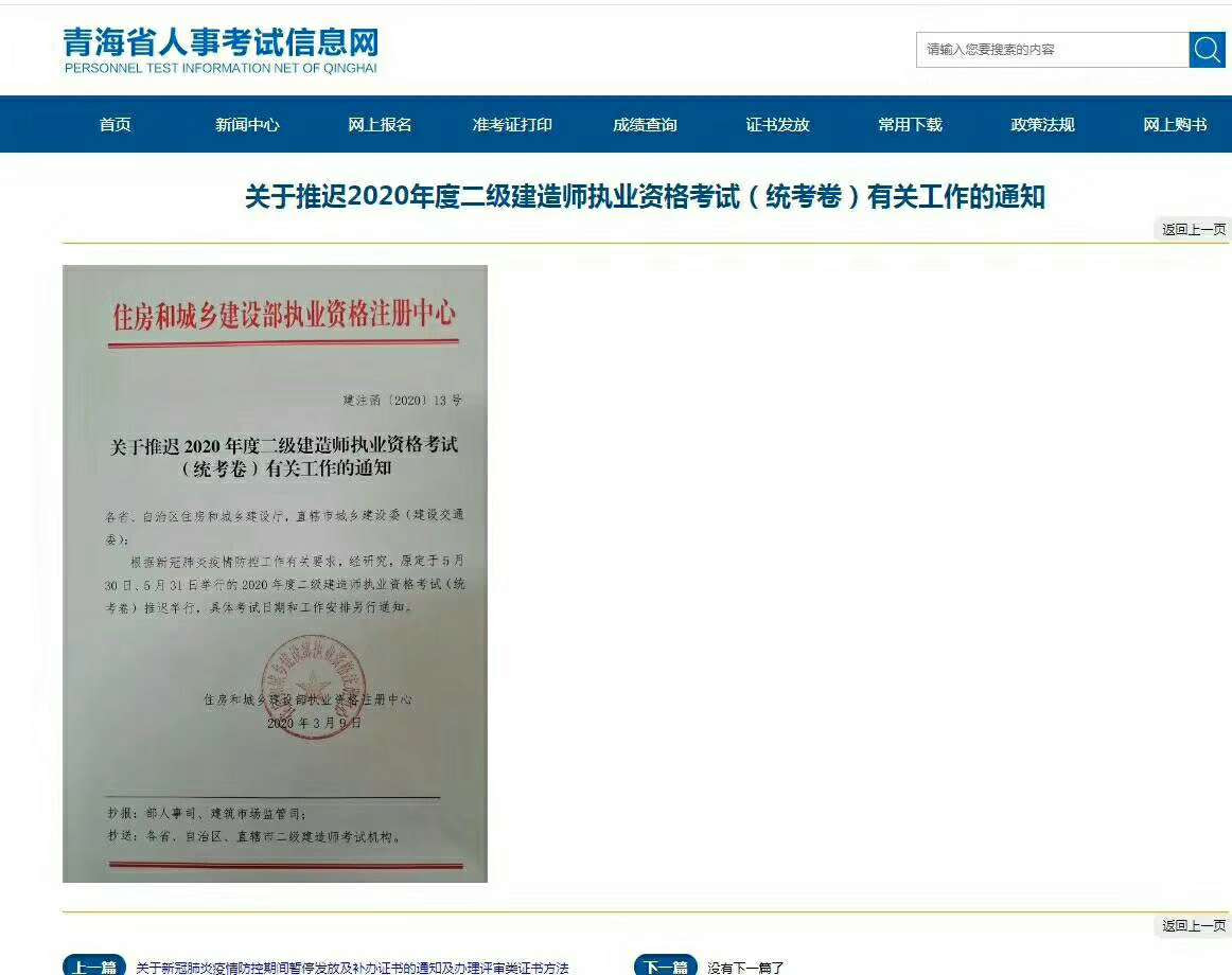 根据住房和城乡建设部执业资格注册中心《关于推迟2020年度二级建造师执业资格考试(统考卷)有关工作的通知》精神,原定于5月30日、31日举行的2020年度二级建造师执业资格考试推迟举行,具体报名时间和考试时间另行通知。
