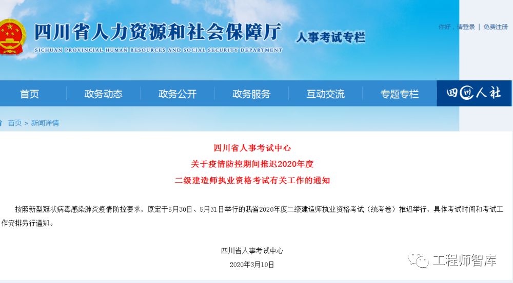 根据新冠肺炎疫情防控工作有关要求,经研究,原定于5月30日、5月31日举行的2020年度二级建造师执业资格考试(统考卷)推迟举行,具体考试日期和工作安排另行通知。