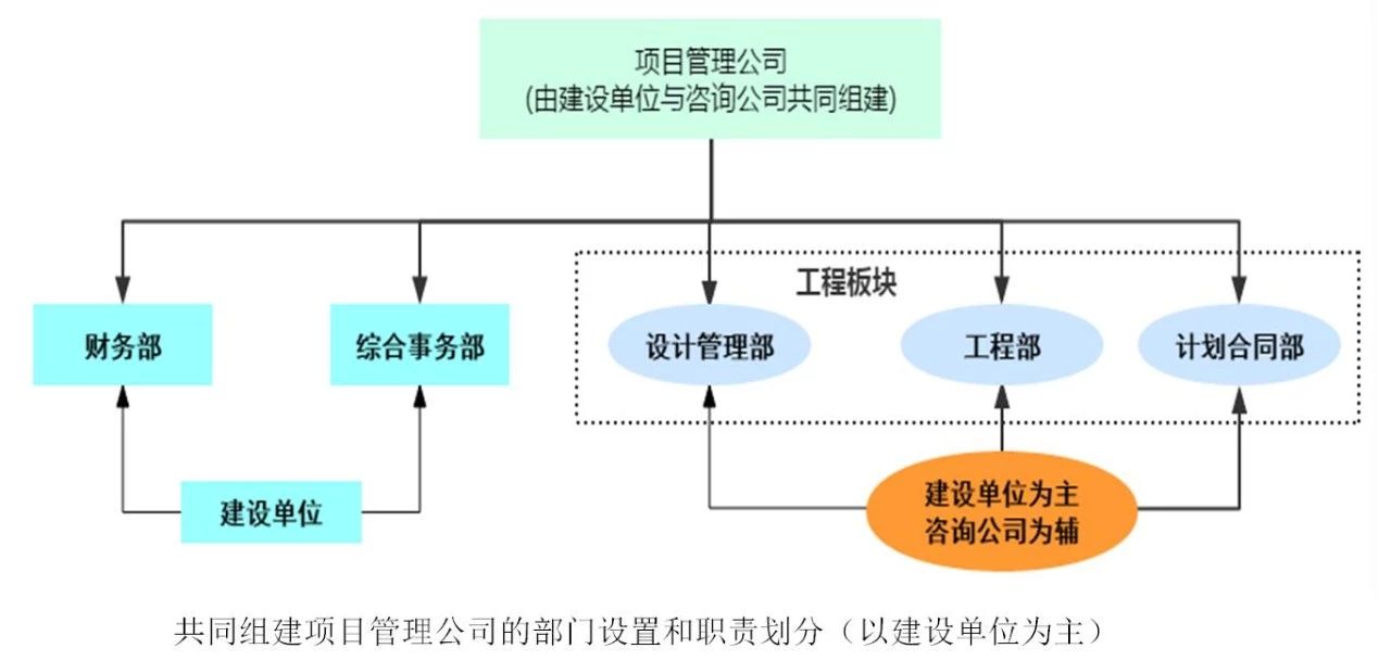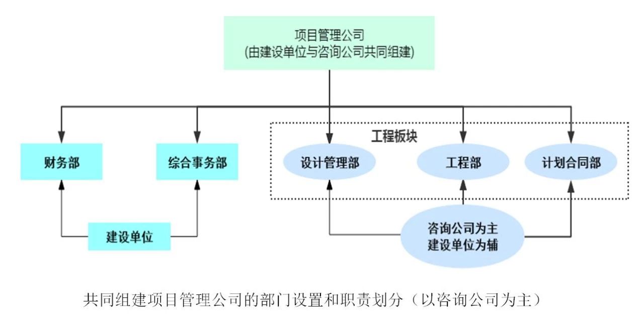这种模式是以建设单位为主,咨询公司为辅一起组建项目公司(或项目部),大部分的专业技术人员由建设单位提供并组建各职能部门,咨询公司仅在工程板块相关部门安排少量技术和管理人员,以此充实和加强各职能部门的技术力量。