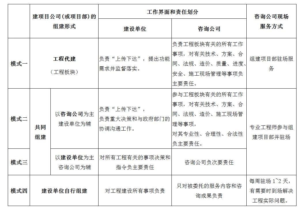 这种模式由建设单位自行组建项目公司(或项目部)和各职能部门,咨询公司不参与组建项目部(人员不常驻现场),仅对项目建设提供前期策划、制度建设、招投标、法律法规、工程管理、合同管理、造价管理等与工程建设有关的技术支持。
