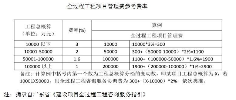 “1”是指全过程工程咨询费,参考费率如表。表中所列收费标准是基于完全由咨询公司组建工程板块各职能部门的收费水平,具体根据咨询公司的参与程度和工作模式分别进行不同程度的折扣。