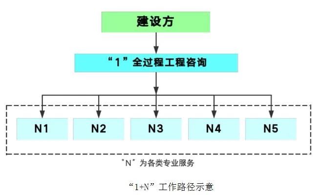 对应“1+N”的收费模式,全过程工程咨询的工作开展模式也可以借用“1+N”的概念?!?”是指全过程工程咨询角色,主要起到牵头、统筹、协调、管理、上传下达等职能要求,对项目上的若干个“N”进行统筹管理;“N”是指项目全过程各专业咨询(投资咨询、勘察、设计、监理、造价咨询、设计咨询、招标代理、法律顾问、试验检测、运营维护等),这些“N”所代表的专业工作可以纳入全过程咨询范畴,也可以另行委托。