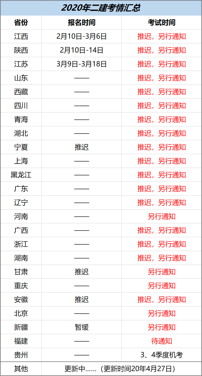 截至目前,有多省发布推迟二建考试的通知,其他省份还需等待下一步工作安排。