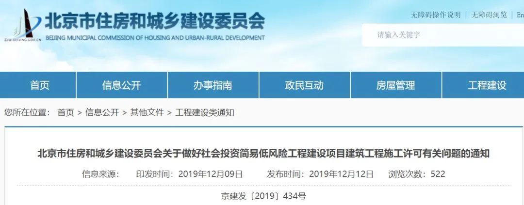 2019年12月9日,北京市住房和城乡建设委员会下发《关于做好社会投资简易低风险工程建设项目建筑工程施工许可有关问题的通知》,明确: