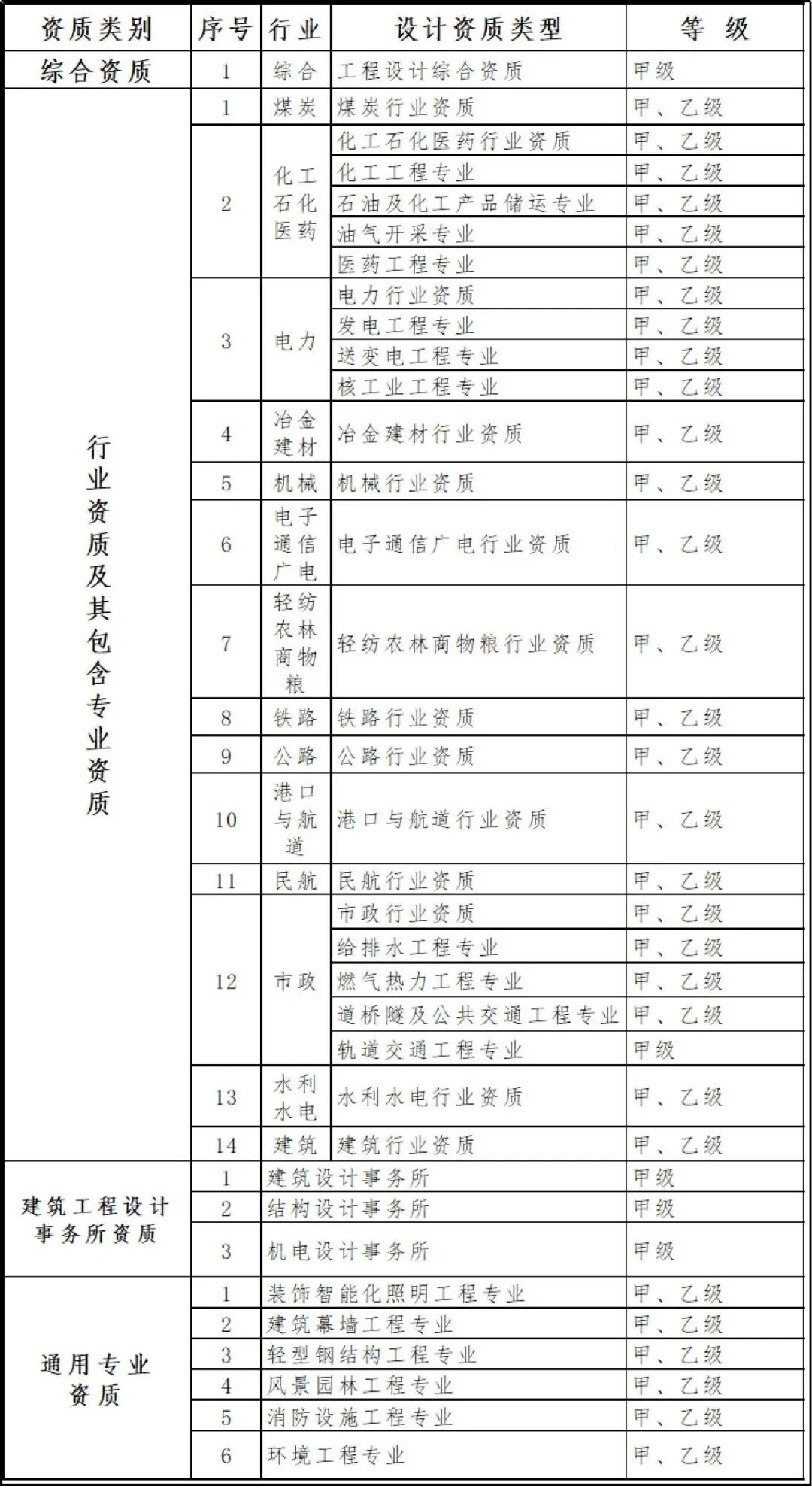保留综合资质。对部分行业资质进行整合,其中,冶金行业与建材行业合并为冶金建材行业资质,轻纺行业、农林行业、商物粮行业合并为轻纺农林商物粮行业,电子行业、通信行业、广电行业合并为电子通信广电行业,石油天然气行业并入化工石化医药行业,军工行业并入机械行业,核工业行业并入电力行业,资质等级压减为甲、乙两级,原丙级资质并入相应行业乙级资质。取消海洋行业及专业资质,相关企业可以换发相近行业资质。整合原化工石化医药、石油天然气、电力、市政行业中的专业资质,资质等级压减为甲、乙两级,原丙级资质并入相应专业乙级资质;取消其他行业的专业资质,并入相应行业资质,原甲、乙级专业资质并入相应等级的行业资质,原丙级专业资质并入乙级行业资质。将专项资质调整为通用专业资质,取消环境工程专项资质的5个专项类别,整合为环境工程专业资质,资质等级压减为甲、乙两级,原丙级资质并入相应专业乙级资质。保留3类事务所资质。