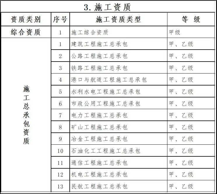 保留原12类施工总承包资质,将机场场道工程专业承包资质、民航空管工程及机场弱电系统工程专业承包资质和机场目视助航工程专业承包资质等合并为民航工程施工总承包资质,取得上述3个专业承包资质中的任一个,即可换发民航工程施工总承包资质。施工总承包资质等级压减为甲、乙两级,甲级资质在本类别内承揽业务规模不受限制,原一级资质调整为甲级资质,其他等级资质合并为乙级资质。
