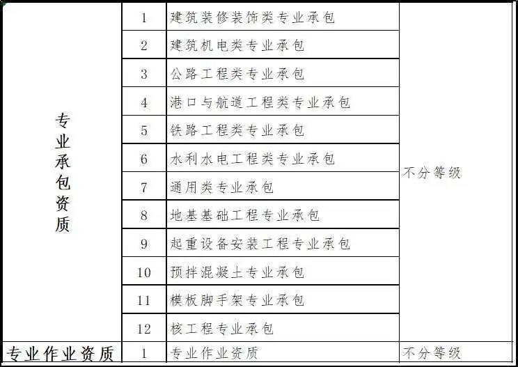 保留地基基础工程、起重设备安装工程、核工程等专业承包资质;将原专业承包资质整合为建筑装修装饰类、建筑机电类、公路工程类、港口与航道工程类、铁路工程类、水利水电工程类、通用类专业承包资质;专业承包资质不分等级。