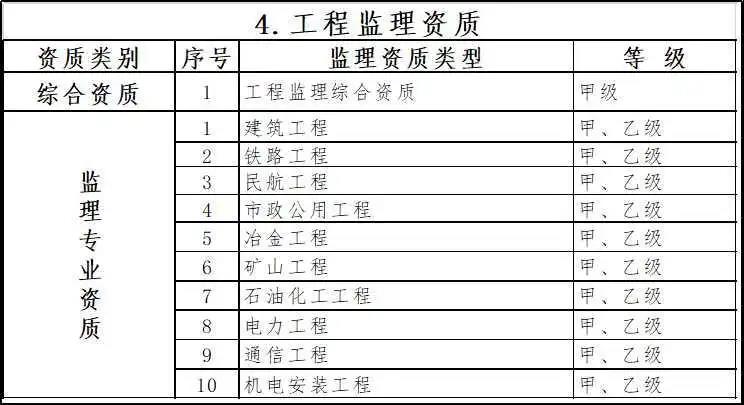 保留综合资质。取消水利水电工程、公路工程、港口与航道工程等专业资质,其资质要求执行有关行业主管部门规定。取消农林工程监理资质,建设单位委托农林工程监理业务时,不再作资质要求。上述4个监理专业资质取消后,相关企业可以换发相近专业同等级监理专业资质。监理专业资质等级压减为甲、乙两级,原丙级资质并入相应专业的乙级资质。取消事务所资质。